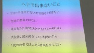 月曜日に大阪で ジアミンを含まないヘアカラーの講習に行ってきました、 先生はヘナの時と同じ先生です。 ジアミンとは150年前にドイツのホフマンという方が発見したヘアカラーの色でイロイロな色が可能ですので150年経っても使われているのでしょう...